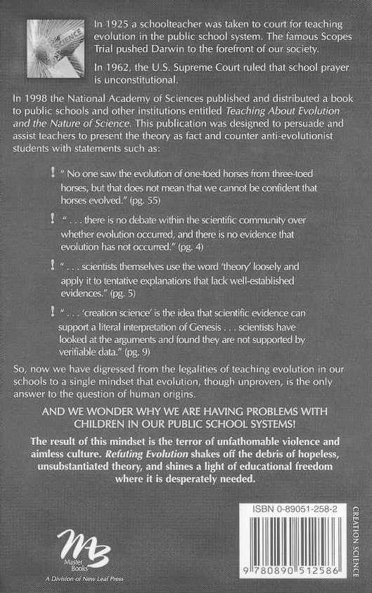 Refuting Evolution seeks to redress the lopsided pro-evolutionary way in which origins are taught. The NAS guidebook, which is compiled by many leading evolutionists, obviously contains the most up-to-date and major arguments for evolution. Thus, this critique of it addresses current evolutionary theory as taught in colleges, public schools, and as broadcast by the media. Refuting Evolution responds to many of the arguments in Teaching about Evolution and the Nature of Science so that a general critique of evolution can be made available to challenge educators, students, and parents. At the same time, Refuting Evolution gives as much positive information as space permits to defend the creationist position. Thus, it provides a good summary of the arguments against evolution and for creation. It should stimulate much discussion and help students and teacher to think more critically about origins.